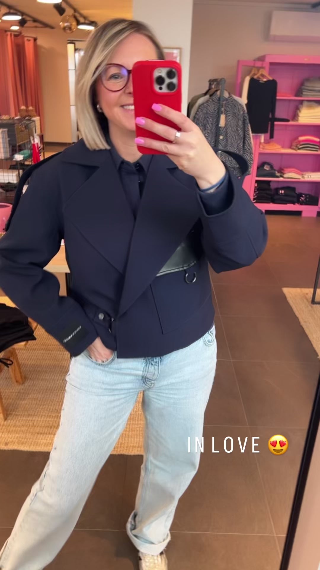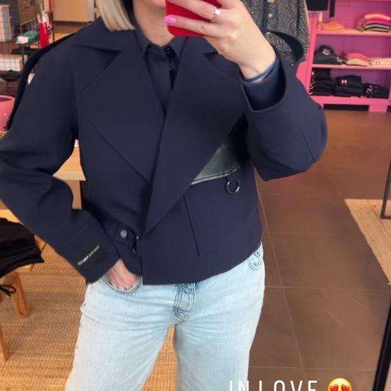 Super leuke jacket in het navy blauw, oversized pasvorm, en leren detail vooraan.